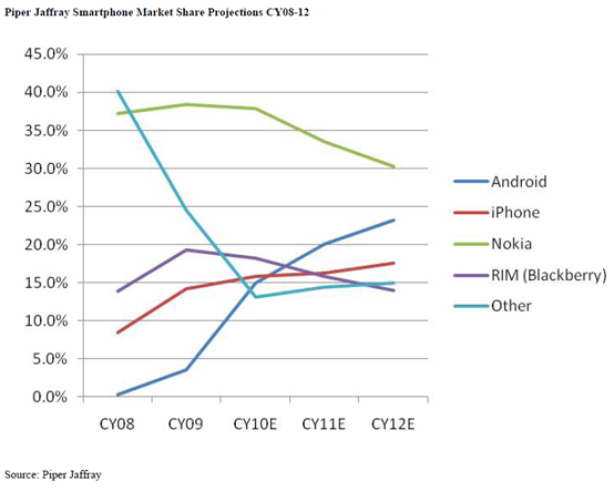 Piper Jaffray schätzen das der Marktanteil von Android bis Ende des Jahres auf 14,9 % ansteigen wird. Bis 2012 sollen es dann schon 23,2 % sein. Noch in diesem Jahr wird Apple und das iPhone mit Anteilen von 15,9 Prozent führend sein aber soll bereits 2012 von Android Smartphones überholt werden und dann nur noch 17,6 % der im Markt befindlichen Geräte stellen. Mit Ablauf der auf 5 Jahre angelegten Langzeitprognose soll Apple sich bei 20 – 30 Prozent Marktanteil einpendeln.