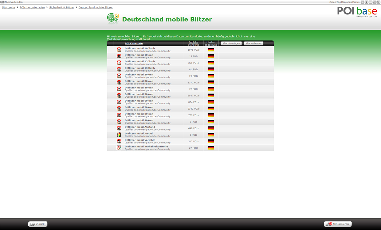 Das Warnen vor Gefahrenstellen oder Hinweisen auf POIs, gelingt beim Vision auch mit externer Software, wie POIbase. Das kostenlos downloadbare Tool ermöglicht die Installation von über 450.000 Sonderzielen aus den unterschiedlichsten Kategorien. Neben umfangreichen Blitzerdaten, stehen zum Beispiel auch aktuelle Tankstellenpreise oder eine Zapfsäulenübersicht für Fahrer von LPG oder CNG Fahrzeugen zur Verfügung.