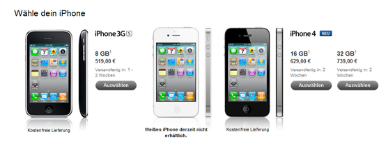 Apple bietet ab sofort das iPhone über seinen Online Store in Deutschland an. Neben dem iPhone 3 GS mit 8 GB steht auch das iPhone 4 in der 16 GB und 32 GB Variante zur Auswahl. Auch das weiße iPhone wird beworben, ist aber derzeit noch immer nicht lieferbar.