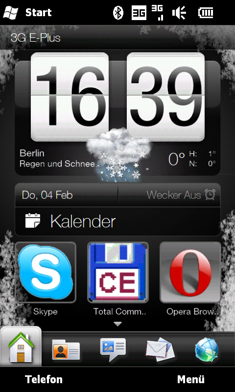 Daneben wurde dem HD2 die HTC-eigene, nutzerfreundliche Bedienoberfläche HTC Sense spendiert, die automatisch nach dem Booten gestartet wird und über den Hardware-Button Startmenü/Home aufgerufen werden kann. HTC Sense zeigt auf der Startseite Uhrzeit, Kalender und standortabhängiges Wetter sowie große Widgets, die der Nutzer frei mit Programmlinks versehen kann. Auch die untere Taskleiste– standardmäßig mit Funktionen wie Kontakten, SMS, Internetbrowser u.v.m. belegt – ist an Nutzerbedürfnisse anpassbar und kann mit dem Finger durchblättert werden.