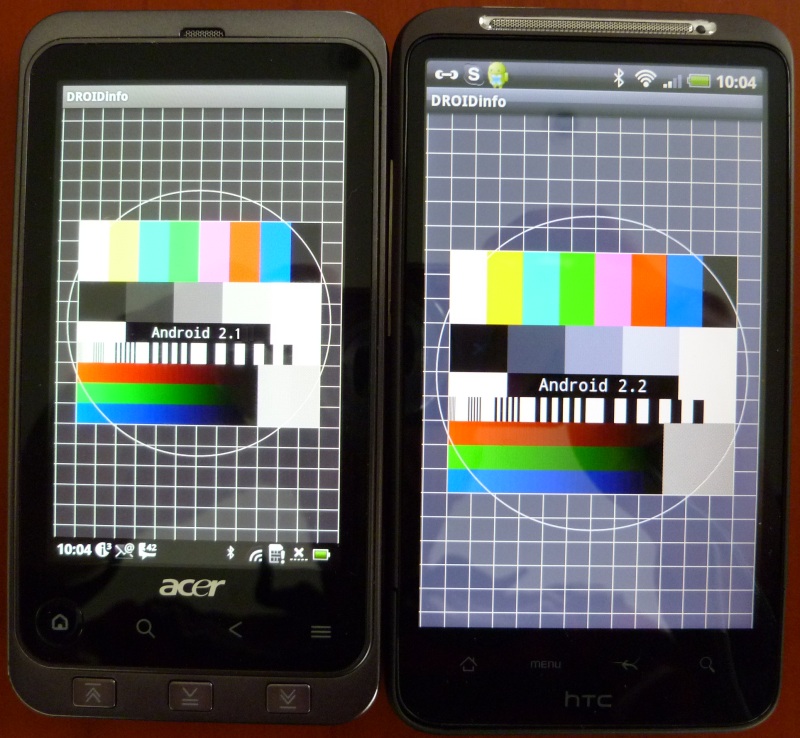 Zwar ist der Touchscreen mit 74 Pixeln/mm sup2; oder 217 ppi (pixels per inch/Pixel pro Zoll) nicht ganz so scharf wie das wesentlich kleinere, hoch auflösende 3,5 Zoll 960×640 Pixel iPhone4-Retina-Display mit 330 ppi, dennoch begeistert das Desire HD durch die schiere Größe seines Bildschirms in Verbindung mit noch sehr gutem Kontrast und hoher Helligkeit.