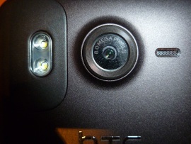 Auf der Rückseite befindet sich neben dem System-/Medienlautsprecher eine 8-Megapixel-Kamera mit Autofokus, Gesichtserkennung und LED-Dual-Blitz, die auch Videos in HD 720p schießen kann. Der rückwärtige Systemlautsprecher ist laut und klar zu vernehmen, eine der besten Tonausgaben, die wir jemals zu hören bekamen. Zugang zu den SIM- und SD-Kartenschächten erlangt man unabhängig vom Akku über die untere zweite Abdeckung. Somit ist ein Hot-Swap während des laufenden Betriebes der SIM- oder Speicherkarten möglich.