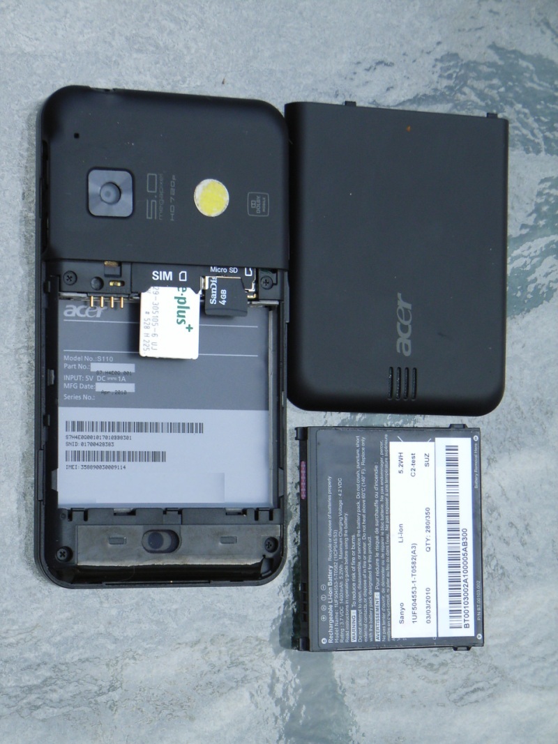 Auf der Rückseite befindet sich neben dem laut und klar zu vernehmenden System-/Medienlautsprecher eine 5-Megapixel-Kamera – leider ohne Blitzlicht –, die auch Videos in HD 720p schießen kann. Zugang zu den SIM- und SD-Kartenschächten ist nur bei geöffnetem Akkudeckel und entfernter Batterie möglich.