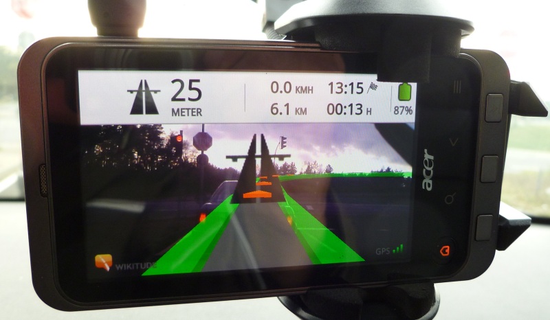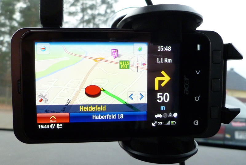 Wir haben das Acer Stream mit verschiedener Navigationssoftware getestet. Sind die oben geschilderten kleinen Schwierigkeiten beim Satfix erst einmal gemeistert, überzeugt das Acer Stream mit hoher Spur- und Lagetreue und ist nahezu schleppfehlerfrei. Karten- und Ansichtswechsel vollziehen sich bei verwendeten Programmen mit der üblich rasanten Geschwindigkeit der Giga-Hertzer. Dank des separaten 3,5 mm Klinkenanschlusses können simultan Kopfhörer und Micro-USB-Ladekabel angeschlossen werden. Als USB-Ladegerät für den Zigarettenanzünder empfehlen wir einen Adapter mit mindestens 1 A Ladestrom. Spiegelungen – mit einer geeigneten Antireflexfolie leicht zu mindern – stören etwas.