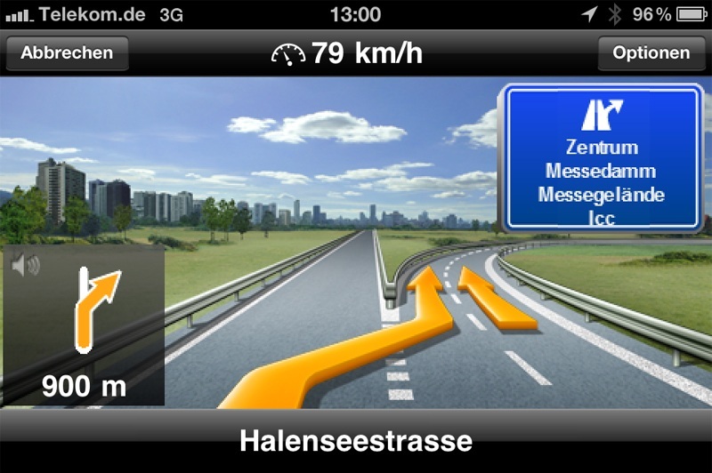 Die Sprachausgabe mit echtem Text-to-Speech (TTS) über den rückwärtigen Systemlautsprecher ist laut und klar; alle anderen Navigationsprogramme waren subjektiv leiser. Wenn das immer noch nicht genug ist, sollte zu einem Bluetooth-Headset (A2DP) oder zu den mitgelieferten drahtgebundenen Kopfhörern gegriffen werden. Merkwürdigerweise hat Navigon die Lautstärke der Sprachausgabe nicht an die Medien- bzw. Systemlautstärke gekoppelt sondern an die des Ereignis- bzw. Benachrichtigungstons für eingehende E-Mails oder SMS.