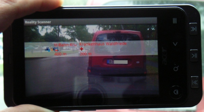Das Navigationsprogramm bedient sich wahlweise online eingespielter Navteq-Karten oder der AR-Darstellung mit Verkehrs- und Abbiege-Overlays. Wählt der Nutzer die AR-Darstellung muss er a) einen Kfz-Halter haben, der die Kamera des Gerätes freilässt und b) für eine peinlich genaue Ausrichtung der Kamera auf die Straße sorgen, sonst zeigen die Overlays überall hin, nur nicht auf die Straße.