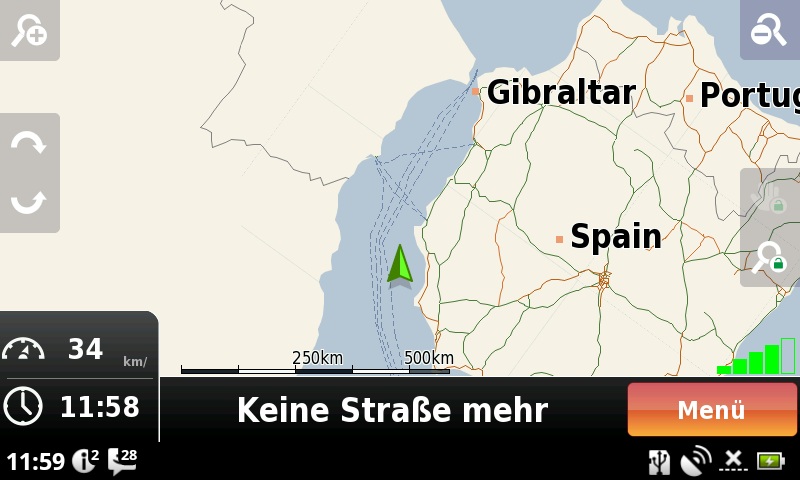 Dieses Verhalten war allerdings nur einmalig in je zwei weiteren Navigationsprogrammen festzustellen. Navionics errechnete eine Schiffsgeschwindigkeit von 180 Knoten inmitten der Sahara. Angeblich nur drei bis vier Satelliten über dem Horizont verhinderten eine genauere Positions- und Geschwindigkeitsbestimmung. Ansonsten war die TTFF (Time to First Fix) in anderen Navigationsprogrammen in Sekunden zu messen und damit äußerst flott.