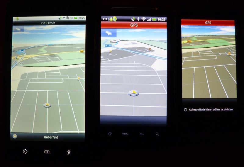 Auch das In-Cell-TFT-LCD benötigt die typische Hintergrundbeleuchtung. Das frisst zwar geringfügig mehr Strom, sorgt jedoch auch für eine gute Ablesbarkeit tagsüber. Diese Eigenschaft plus der enormen Dimension sowie 24 bit Farbtiefe (16,7 Mio. Farben) lassen das Dell Streak zum Konkurrenten für großformatige Navigationssysteme (PNA) auflaufen. Das Bild zeigt drei Technologien im Vergleich: Dells 5 Zoll In-Cell-TFT, Sonys 4,3 Zoll Super-TFT-LCD (SLCD) beim HTC Desire HD und 3,7 Zoll AMOLED beim Acer Stream.