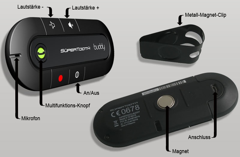 Beide Freisprechanlagen haben einen Magneten, der den Clip zur Befestigung an der Sonnenblende hält. Sie sind voll duplexfähig – d.h. gleichzeitiges Sprechen beider Teinehmer ist möglich und bieten darüber hinaus Wahlwiederholung und Handling von Anrufen in der Warteschleife (On-Hold-Funktion).