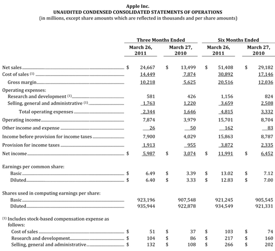 Im zweiten Quartal des Geschäftsjahres 2011 konnte der Konzern mit 18,65 Millionen rund 113 Prozent mehr iPhones verkaufen als im vergleichbaren Vorjahresquartal. Der Stückzahlen der verkauften iPods gingen um 17 Prozent auf 9,02 Millionen zurück. Zudem verkaufte Apple 3,76 Millionen Macs, eine Steigerung um 28 Prozent. Trotz des guten iPad Starts im vergangen Jahr, lagen die Absatzzahlen unter den Prognosen der Marktexperten: 4,69 Millionen iPads gingen im zweiten Quartal 2011 über den Ladentisch, erwartet wurden 6,1 Millionen.