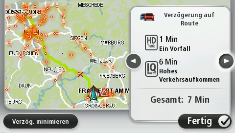 LiveTraffic liefert aktuelle Verkehrsinformationen, die unter anderem auch durch die Nutzer der Geräte mit Live-Services übermittelt werden. Dadurch kommen Verkehrsinformationen zustande, die tatsächlich derzeit einmalig sind. Überrascht hat uns auch die Genauigkeit, mit der dieses System funktioniert. Auf einer Fahrt in die Innenstadt von Nürnberg hat uns das GO LIVE 1000 beispielsweise punktgenau einen Stau auf der Bundesstraße B 2 angezeigt, der Beginn des Staus deckte sich exakt mit der übermittelten Störungsmeldung. Auch auf weiteren Fahrten haben wir die Kombination aus Live-Diensten und IQ-Routes als absolut verlässlich kennengelernt. Bei Störungen wurde dann eine Umfahrung angeboten, wenn diese tatsächlich sinnvoll war und auch eine Zeitersparnis brachte. In diesem Fall meldete das GO LIVE 1000, dass eine schnellere Strecke verfügbar ist. Der Nutzer hat dann jeweils die Auswahl, ob diese Strecke auch benutzt werden soll.