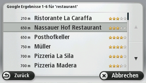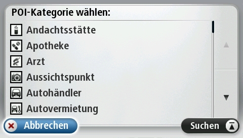 Standardmäßig bringt das TomTom GO LIVE 1000 bereits die gebräuchlichen POI-Kategorien wie Tankstellen, Geldautomaten, Krankenhäuser etc. mit, die Google-Suche ermöglicht auch die Navigation zu Punkten, die innerhalb der gespeicherten POI nicht enthalten sind.