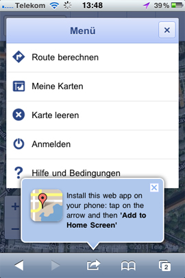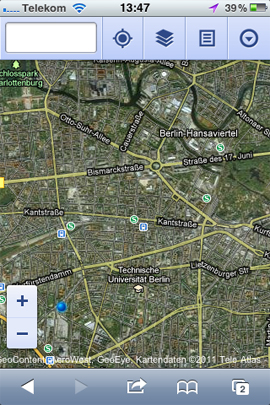 Die mobile Version von Google Maps ist über den Link maps.google.com erreichbar und bietet fast alle Funktionen, die auch über den PC Browser zur Verfügung stehen. Um alle Funktionen nutzen zu können, muss beim Besuch der Webseite bestätigt werden, dass auf die Ortungsfunktion des mobilen Gerätes zurückgegriffen werden darf.