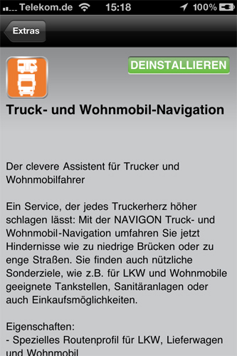 Seit 2009 bietet NAVIGON die Navigationssoftware MobileNavigator auch fürs iPhone an. Die umsatzstarke App wurde nun um ein weiteres Feature ergänzt. Als in App Kauf kann zusätzlich die schon von der PNA Version bekannte Truck und Camper Navigation hinzu gekauft werden. Für dieses Feature verlangt NAVIGON 79,99 EUR.
