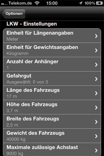 Die iPhone Variante der Truck und Camper Navigation bietet nahezu dieselben Einstellmöglichkeiten wie die PNA Version der Software. Es können individuell Länge/Breite/Höhe/Gesamtgewicht sowie auch einzelne Achslasten im Menü eingegeben werden. Bei der Gefahrguteingabe wird in 3 Kategorien unterschieden.