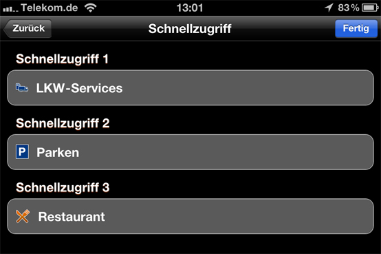 Wer mit diesem LKW und Wohnmobil in App seine Navigations Software erweitert, bekommt auch zusätzlich LKW spezifische Sonderziele (POI) installiert. Sucht der Fahrer beispielsweise eine Tank- und Übernachtungsmöglichkeit, kann er über die POI-Suche einen Autohof ausfindig machen und sich bequem dorthin navigieren lassen. Mit einem Klick auf den Standort erhält der Nutzer weitere Informationen, wie akzeptierte Zahlungsarten (viele Spediteure benutzen den DKV-Service um ihre Fahrzeuge unterwegs aufzutanken) oder ob eine Duschmöglichkeit oder ein Restaurant vorhanden ist. Auerdem wird auf LKW-Shops hingewiesen, die alles zu bieten haben, was das Trucker-Herz höher schlagen lässt.