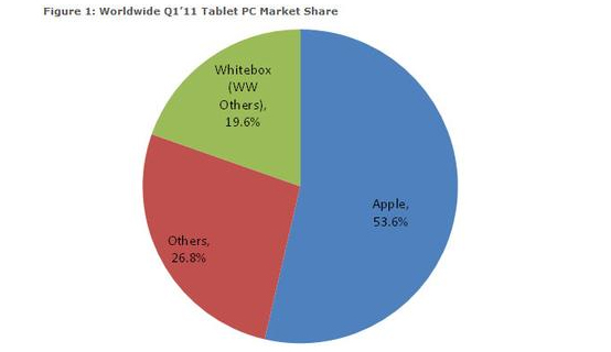 Im ersten Quartal 2011 sollen weltweit 9,7 Millionen Tablet verkauft worden sein davon waren 5,2 Millionen iPads. Im vergleichbaren Quartal des Vorjahres konnten im Gesamtmarkt übrigens 5,2 % mehr Tablets abgesetzt werden. Nicht unbedeutende 19,6 % des Kuchens entfallen aktuell noch auf so genannte Whitebox-Tablets, die häufig aus China stammen und dort durch ein veraltetes Android-Betriebssystem oder dürftige Hardware vergleichsweise günstig angeboten werden. Die restlichen 26,8 % teilen sich etablierte Hersteller wie HTC, Samsung oder RIM.