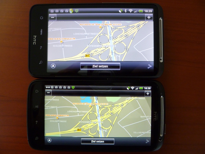 Bei der Kartendarstellung hinterlässt das HTC Sensation eindeutig das kontrastreichere und schärfere Bild im Vergleich zum HTC Desire HD. Das qHD-Display mit höherer Pixeldichte kommt der Navigation voll zugute; allerdings wirken Details kleiner bzw. der dargestellte Kartenausschnitt größer. Ursächlich sind die jeweiligen Anpassungen an die WVGA-Auflösung des Desire HD mit 480 x 800 Pixeln bzw. an die qHD-Auflösung des HTC Sensation mit 560 x 960 Pixeln.