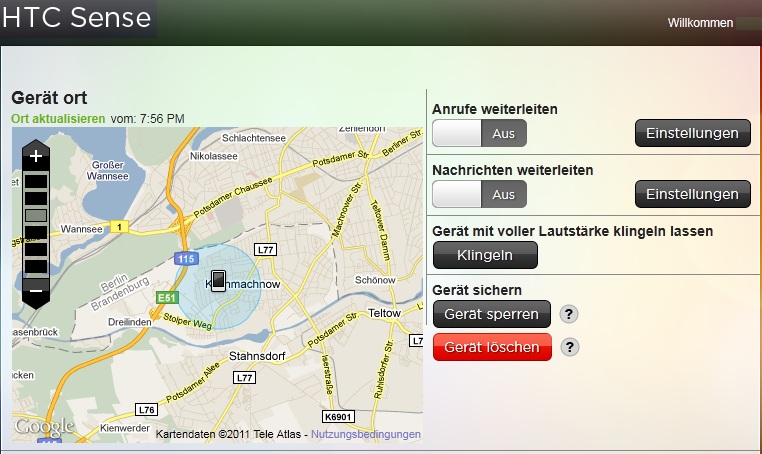 Genial sind immer noch die Connected Services HTCSense.com. Dort „läuft″ sozusagen das Smartphone unter einer PC-Oberfläche. Kontakte können geführt und das Telefon eigenen Wünschen einschließlich Klingeltönen angepasst werden. Herausragendes Merkmal dieser Website ist der Ortungsdienst. In einer Karte wird weltweit angezeigt, wo sich das HTC Sensation aktuell befindet. Die Navigation wird ebenfalls erleichert: Das Ziel wird auf dem PC gesucht, und man kann anschließend mit diesen Infos auf dem Telefon losziehen. Der vergessliche Nutzer kann das Smartphone außerdem laut klingeln lassen und so das Gerät leichter finden. Bei Totalverlust oder Diebstahl lässt sich das Gerät per Fernbefehl sperren oder löschen, und es wird somit nutzlos für den unehrlichen Finder oder Dieb. Zudem ist es möglich, Anrufe oder Nachrichten beispielsweise an E-Mail-Adressen oder andere Telefone weiterzuleiten.