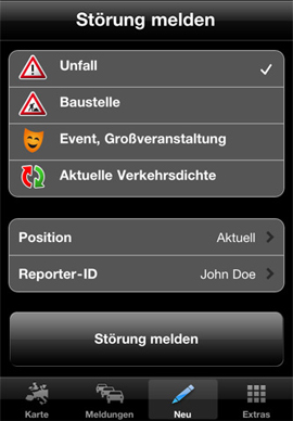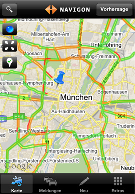 NAVIGON hat auch seine traffic4all App überarbeitet. Diese zeigt nun von anderen Nutzern gemeldete Störungen in einer übersichtlicheren Listenansicht. So können Verkehrsbehinderungen geordnet nach Entfernung zur momentanen Position oder zur angegebenen Adresse angezeigt werden. Verbessert wurde auch die Report-Funktion mit der Staus an die Community gemeldet werden können.