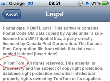 Findige Entwickler haben in den Copyright Informationen des iOS 5 Einträge verschiedener Unternehmen gefunden, die darauf hinweisen könnten, dass Apple an einem eigenen Kartenservice arbeitet. Darunter befindet sich die Hersteller TomTom, Urban Mapping sowie Waze. Bereits 2009 und 2010 hatte Apple die Kartenanbieter PlaceBase und Poly9 übernommen.