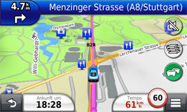 Auf den neuen Geräten der nüvi und nüLink! Serien hat Garmin auch seinen Verkehrsservice erweitert. Die Einbeziehung von historischen Verkehrsdaten und NAVTEQ Traffic Verkehrsmeldungen für eine dynamische Berechnung der Route und Ankunftszeit hat Garmin eine neue Benutzerführung und Darstellung spendiert. So werden Warnhinweise jetzt direkt im oberen Teil des Bildschirms angezeigt. Verkehrsinformationen sind auf der Karte deutlicher ablesbar und werden zusätzlich mit den Abbiegehinweisen angekündigt.
