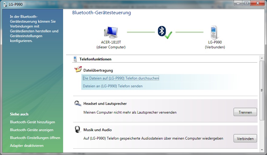 Leider sind weder Verbindung noch Synchronisierung mit dem PC über Bluetooth möglich – die unter Windows angezeigte Dateiübertragung geht z.B. nicht –, wenn auch gewisse Funktionen auf den PC gelegt werden können.