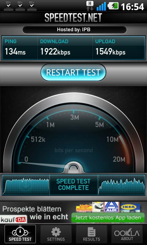 Wir maßen bei schwachem E-Netz immerhin knapp 2 Mbit/s im Down- und rd. 1,5 Mbit/s im Upload.
