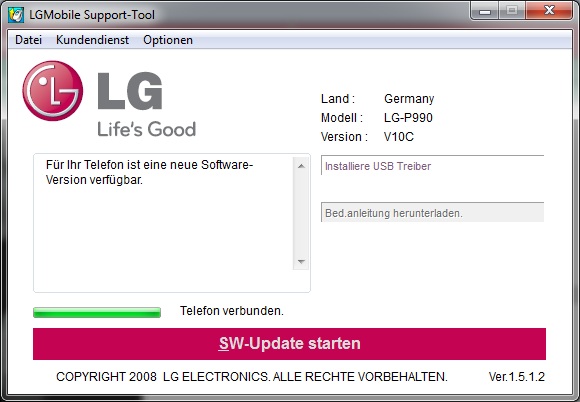 Wir wenden uns wieder der Support-Webseite zu und erfahren dort, dass für das LG P990 ein Update verfügbar sei. Dasselbe vermeldet der LG Updater. Das Herz klopft, sollte es sich etwa um das Upgrade auf Android 2.3 handeln? Und wie kommt das Update auf das P990?