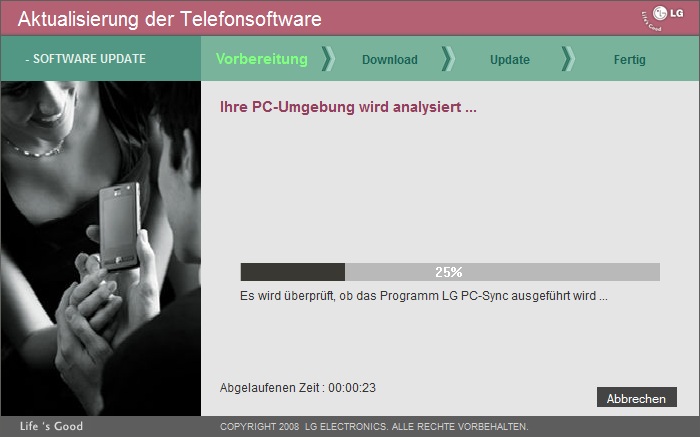 - Methode 2: LG Updater → SW-Update starten → ein neues Fenster Aktualisierung der Telefonsoftware meldet, dass kein Update verfügbar sei und man den Kundendienst kontaktieren möge
