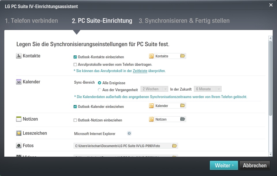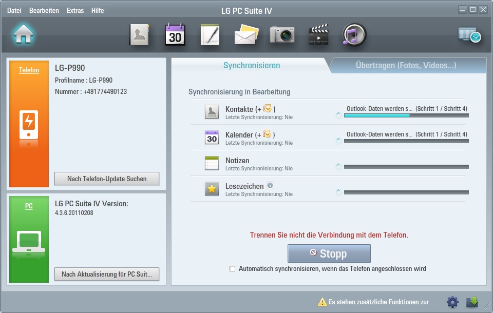 Ein Blick beim LG Updater auf dem Reiter Kundendienst und den Menüeintrag Applikationen, Anleitungen Treibern verrät, dass als einzige weitere Software PC Suite IV herunterzuladen ist, die u.a. für die Synchronisation mit MS Outlook u.v.m. zuständig ist. Also auch die Suite fix heruntergeladen, dann ist es mit fix auch schon vorbei. Etwas Kaffee trinken und spazieren gehen ist während der Installation angesagt, ebenso wie bei der folgenden Erstsynchronisation. Nebenbei schießt PC Suite den gerade eben installierten GPS NMEA Port Treiber wieder ab. Erst wiederholte Treiber-De- und Re-Installationen zeigen zufriedenstellende Ergebnisse.