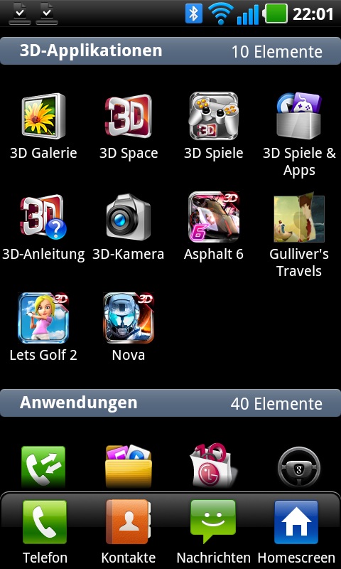 Ein Tipp auf die rechte untere „Würfel″-Taste erschließt diesmal nicht die gewohnte Android-Ansicht. LG hat auch hier dem P920 eine eigene GUI spendiert, die die Kategorien-Ansicht in 3D-Applikationen, vorinstallierte Anwendungen sowie Downloads dreiteilt und somit etwas Ordnung schafft. Auf Wunsch sind auch Seiten-Ansicht und Listen-Ansicht wie beim Optimus Speed möglich. Ein weiteres Extra ist der Auto-Modus für Navigation, hinter dem sich im Wesentlichen Google Maps und Google Maps Navigation verbergen.