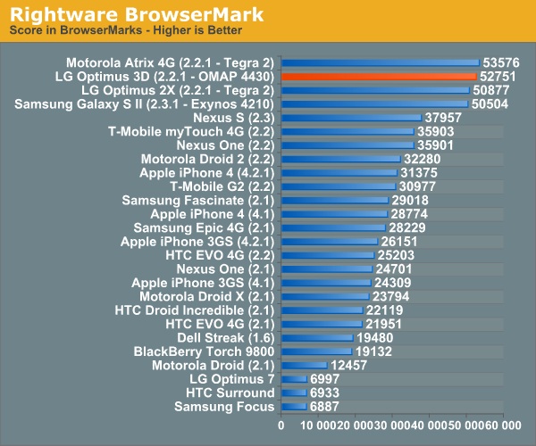 Der Chipsatz des LG Optimus 3D, der OMAP 4430 von Texas Instruments (TI), soll derzeit schnellste auf dem Markt sein. Er führte noch im Frühjahr fast alle Benchmarks an, wie ein Test des Blogs AnandTech ergab. Die Website hatten die Doppelkerner LG Optimus 3D, LG Optimus Speed und Samsungs Galaxy SII einer Reihe von Benchmarks unterzogen, die unter anderem die Grafik-Performance messen oder den Umgang mit der Browsertechnik Javascript.