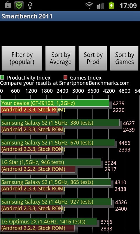 Die im Folgenden dargestellten grau unterlegten Benchmark-Grafiken stammen aus Zeiten, in denen das Samsung Galaxy SII noch mit 1 GHz als Vorseriengerät lief. Das heutige feingetunte und hochgetaktete Seriengerät dürfte Einiges besser abschneiden. Dies schmälert jedoch nicht die Aussagekraft für das Optimus 3D.