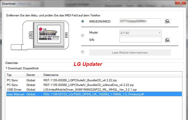 - Methode 2: LG Updater → SW-Update starten → ein neues Fenster Aktualisierung der Telefonsoftware. Diese Methode schlug beim Optimus Speed noch fehl. Zu unserem Erstaunen wird das Software-Update beim P920 korrekt und tadellos durchgeführt.
