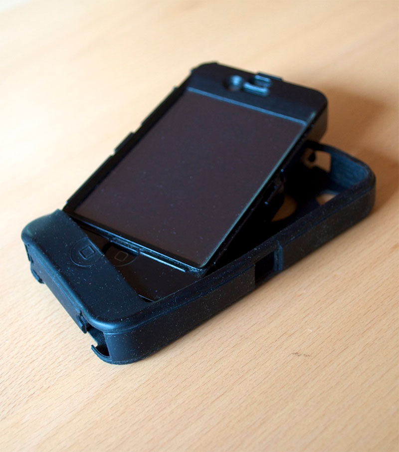 Die Schutzhülle besteht aus 2 Kunststoffhalbschalen, in die das iPhone 4 passgenau eingelegt wird. In die Oberschale mit integriertem Displayschutz wird das Gerät auf der einen Seite eingeschoben. Die Unterschale lässt sich fest über Nuten und ein Klicksystem verbinden. Ein weiterer wichtiger Bestandteil ist die Silikonummantelung, welche dieses Konstrukt stoßabsorbierenumschließt. Der Ein/Ausschalter, Kopfhörerzugang sowie die Ladebuchse können durch an der Ummantelung angebrachte Laschen zusätzlich abdgedeckt und geschützt werden.