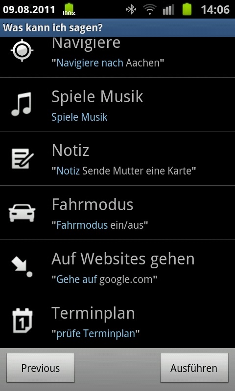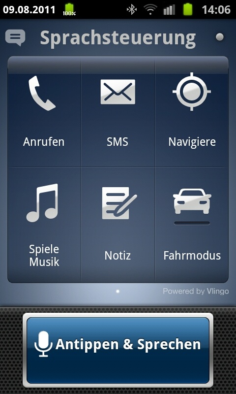 Vlingo und geht weit über die von Google gewohnte hinaus. Sie wird per Tastendruck oder mit dem Kommando „Hallo Galaxy″ aktiviert. Anrufe, SMS, Musik, Navigation und Notizen können damit aufgerufen werden. Sehr nützlich im Auto ist der Fahrmodus, der eingehende oder eingegangene Nachrichten vorliest, sodass die Hände am Lenkrad bleiben. Vlingo ist für andere Fabrikate gratis im Android Market erhältlich.