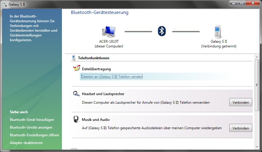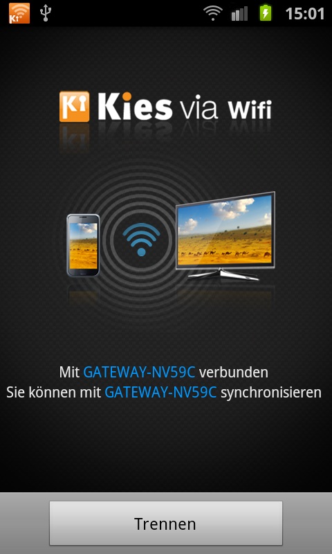 - 2. Drahtlos über WiFi/WLAN: Auf dem Galaxy SII unter Einstellungen → Drahtlos und Netzwerke → Kies über WLAN wählen. Der PC meldet sich, ob die Verbindung zugelassen werden soll.