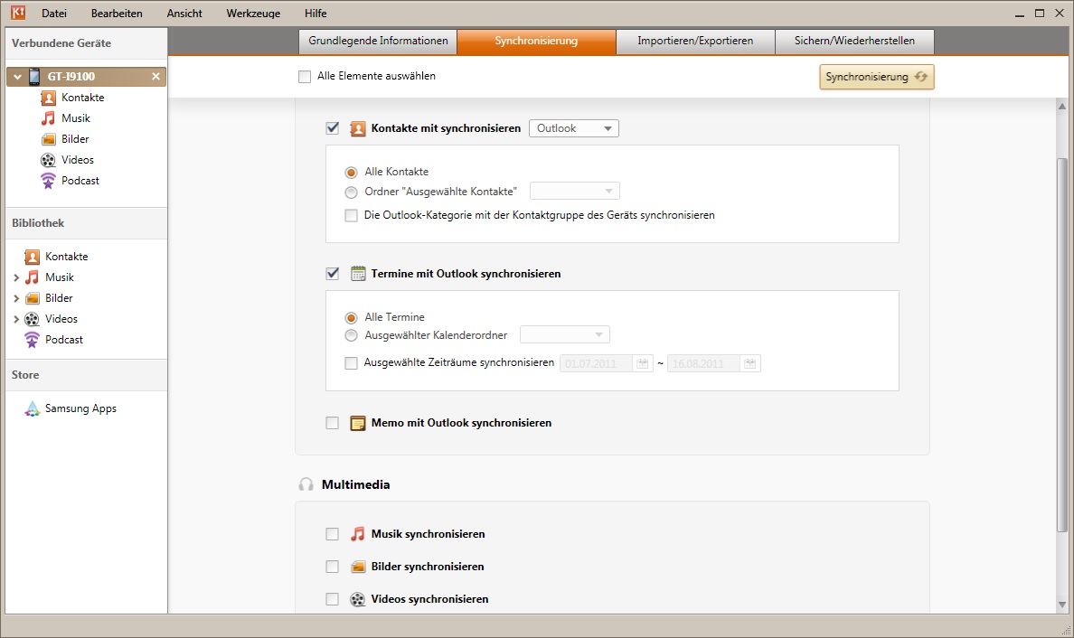 Was ist zu tun? Bei Sync-Software kocht heute jeder sein eigenes Süppchen, so auch Samsung. Ohne das Abgleichprogramm Kies (wer hat sich so einen Namen ausgedacht?) werden wesentliche Treiber nicht installiert. Läuft Kies erst einmal, entpuppt es sich trotz weit verbreiteter Kritik als ganz passables Programm, das zwar nicht an iTunes heranreicht, aber zuverlässig Termine und Kontakte mit Outlook, Google und Yahoo synchronisiert, Daten und Nachrichten auf dem PC sichert sowie Multimediacontent überträgt. Videos und Bilder können nicht nur konvertiert, sondern auch bearbeitet werden. Darüber hinaus ist Kies auch für Soft- und Firmware-Updates sowie komplette Datensicherung und Restore zuständig.