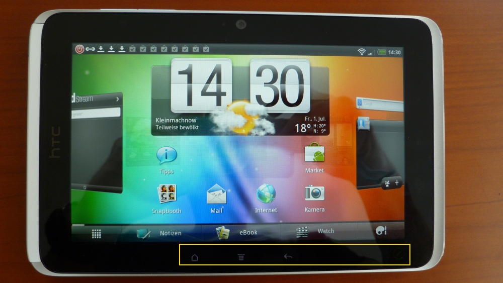 Wir finden auf dem HTC Flyer drei übliche Android-Tasten für Startbildschirm, Menü und Zurück. Suchen wurde eingespart zugunsten einer berührungsintensive Schaltfläche, die nur mit dem Spezialstift (Stylus) bedient werden kann. Der Clou ist, dass das Bedienfeld zwei Mal vorhanden ist. Wird der Flyer vom Hochformat/Portrait-Mode ins Querformat/Landscape-Mode geschwenkt, „wandert″ das Bedienfeld mit; ein nützliches Feature. Weiter finden wir eine Lautstärkewippe an der Schmalseite links oben.