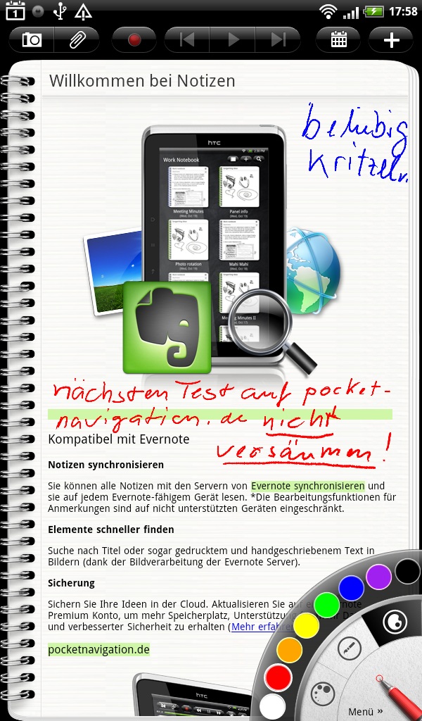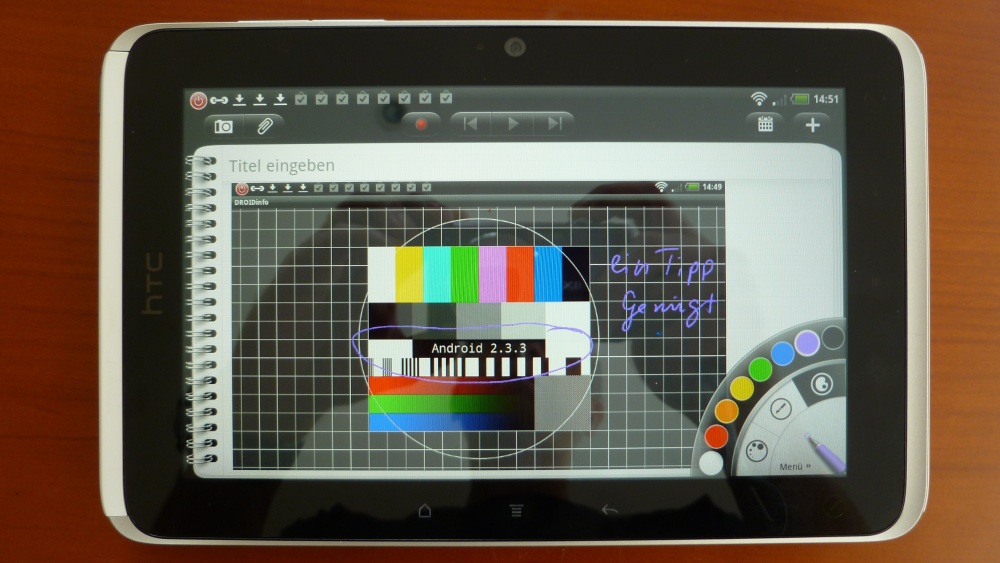 Ein Tipp mit dem Spezialstift auf die Touchscreen-Oberfläche genügt, und der Kritzelmodus wird gestartet. Damit kann man Wichtiges einrahmen oder handschriftliche Texte einfügen. Das Ganze wird als Screenshot gespeichert und in HTC Notes eingefügt. Eine Berührung der Zeichenstift-Schaltfläche neben dem Android-Bedienfeld lässt das Options-Menü für den magischen Stift erscheinen. Damit können Farben, Zeichengerät (Stift, Pinsel) oder Linienbreite eingestellt werden. Ist die App für den Stylus nicht geeignet, meldet sich das Flyer mit einer entsprechenden Benachrichtigung. Die Stiftoption ist ein Feature für diejenigen, die Handschrifteinträge bisher vermisst haben; dadurch hebt sich das Flyer, das in einer Frühphase auch HTC Scribe genannt werden sollte, von den Mitbewerbern ab.