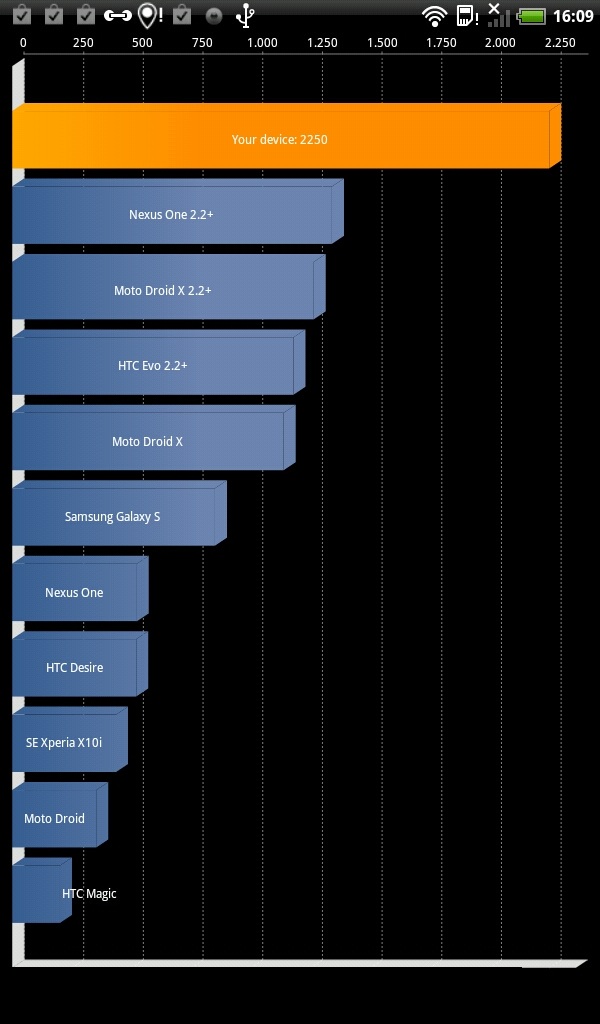 Grundsätzlich darf man sich von den Benchmarkings eines Tablets im Vergleich zu einem Smartphone nicht allzu viel erwarten. Die größeren Displays beanspruchen Rechenleistung (und Akkulaufzeit), was sich in den Standardtests niederschlägt, gerade bei grafikintensiven Anwendungen. Selbst aktuelle Doppelkern-Tablets reißen mit 1200 bis 1500 Punkten beim Quadrant-Test keine Bäume aus im Vergleich zu Spitzenreitern wie dem Smartphone Galaxy S II mit Ergebnissen jenseits von 3000 Punkten.