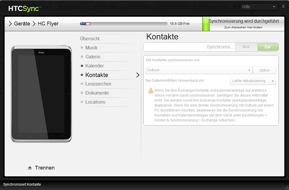 HTC hat hierfür HTCSync entwickelt, dasOutlook/Outlook Express Kontakte und Kalender zwischen PC und Smartphone abgleicht, ebenso wie Fotos, Videos, Musik und Dokumente. Außerdem können Android Dritt-Apps (.apk) mit HTCSync auf dem Gerät installiert werden. Leider synchronisiert HTCSync immer noch nicht Daten mit 64-bit Outlook-Versionen, obwohl die Software inzwischen einige Monate zu haben ist. 32-bit Versionen sind unproblematisch. Leider funktionierte HTCSync nach Aufspielen des OTA-Softwareupdates 2.00.405.3 nicht mehr (getestet auf zwei Laptops). Der Screenshot wurde vor dem OTA-Update aufgenommen unter SW-version 1.36.405.5. Die Panne wurde mit Software-Version 2.23.405.3 wieder behoben.
