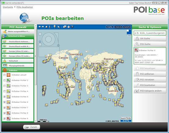 Mit der Zusatzsoftware POIbase stehen die Daten jetzt für die meisten Navigationsgeräte zum Download bereit. In der Kategorie Sicherheit Blitzer – Erdbeben können die Erdbebendaten als POI-Kategorien zur Auswahl hinzugefügt und auf das Navi übertragen werden.