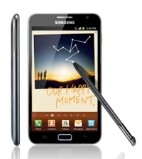Der schlanke und relativ leichte Riese misst B x H x T = 146,85 x 82,95 x 9,65 mm, bringt 178 g auf die Waage und läuft under Android 2.3 (Gingerbread). Eine Spezialität des Galaxy Note ist die Notizbuchfähigkeit analog HTC Scribe beim Tablet HTC Flyer. Ein kapazitiver Spezialstift (S-Pen, Touchpen) gehört zum Lieferumfang und wird im Gerät „unverlierbar″ untergebracht.
