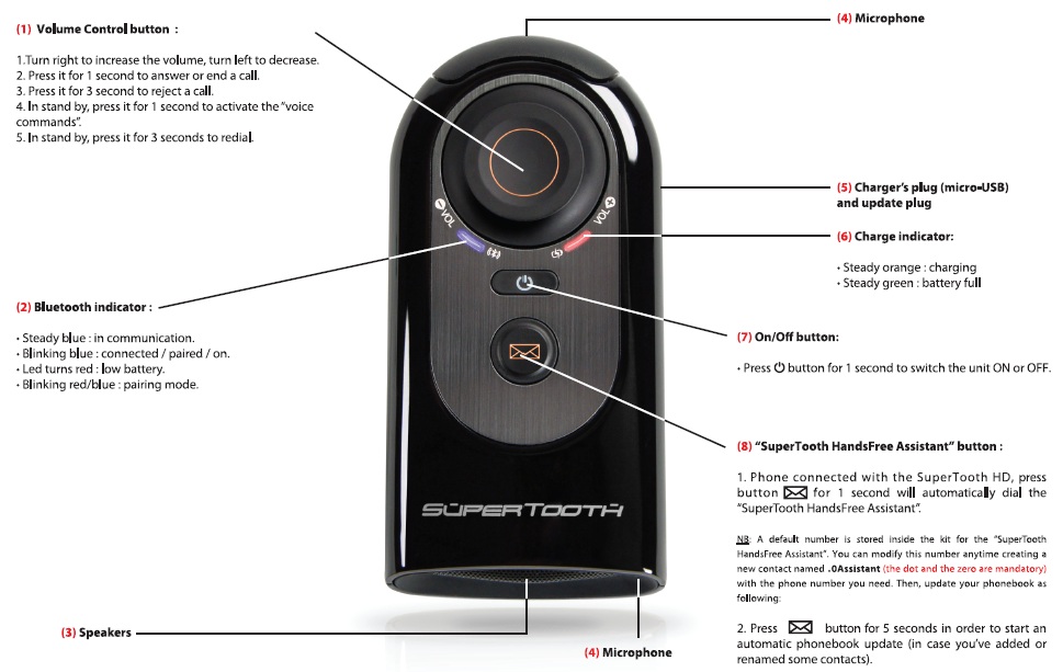 Das SuperTooth HD lässt sich sowohl per Knopf- oder Tastendruck als auch sprachgesteuert bedienen. Die wichtigste Sprachfunktion ist wohl ein einfaches „Okay″ für die Gesprächsannahme, was in jeder Sprache funktioniert und die einzige Sprachsteueuerungsfunktion des HD-List. Leider sind Sprachbefehle wie
