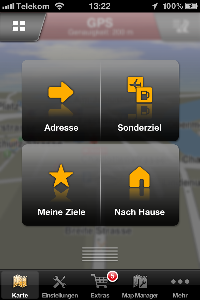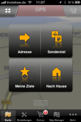 Mit der neuen Benutzerobefläche kommt die NAVIGON App jetzt übersichtlicher daher. Nach dem Start der Software stehen beispielsweise gleich die wichtigsten Funktionen zur Verfügung und auf Wunsch kann direkt auf die Karte gewechselt werden. Überhaupt ist die Karte mit NAVIGON 2.0 mehr in den Mittelpunkt gerückt, so wird sie halbtransparent im Hintergrund der meisten Menüs dargestellt. Auch die iPhone-typischen Multi-Touch-Gesten hat NAVIGON besser in die App integriert, was das drehen, verkleinern oder vergrößern der Karte jetzt noch einfacher macht.