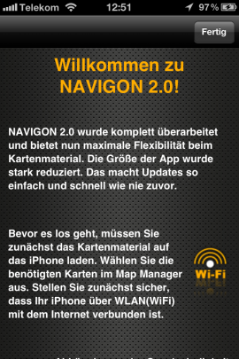 NAVIGON hat den zur IFA angekündigten Sprung seiner iPhone und iPad App von Version 1.8 auf 2.0 durchgeführt. Das von vielen Nutzern erwartete Update umfasst neben einer komplett überarbeiteten Benutzeroberfläche auch ein Kartenverwaltungssystem und ermöglicht den Abschluss des NAVIGON FreshMaps XL Kartenabos.