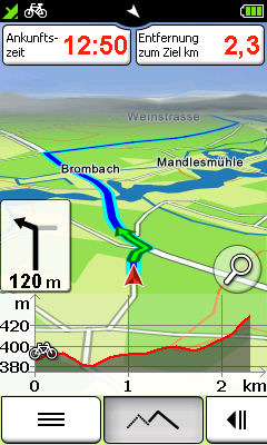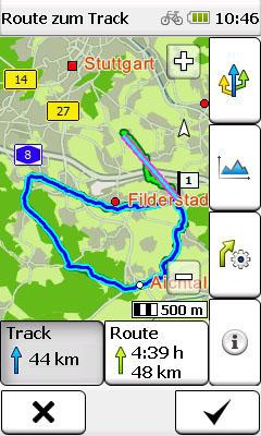 Ein speziell nennenswertes Detail ist die erweiterte Tracknavigation, mit der man extern geplante GPX-Tracks in eine Zielführung auf dem Wegenetz umwandeln kann. Hierdurch wird eine echte Navigation inklusive gesprochener und visueller Abbiegehinweise auf Tracks möglich.