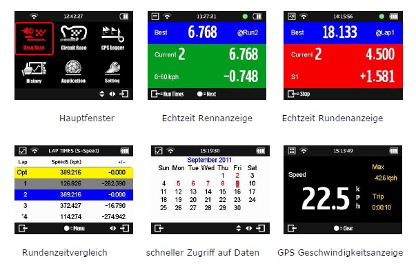 Der Laptimer kann für Rennarten wie Drag Race (Beschleunigungsrennen), Circuit Race (Rundstrecken-Rennen), Rallye Rennen oder Leistungstests verwendet werden.